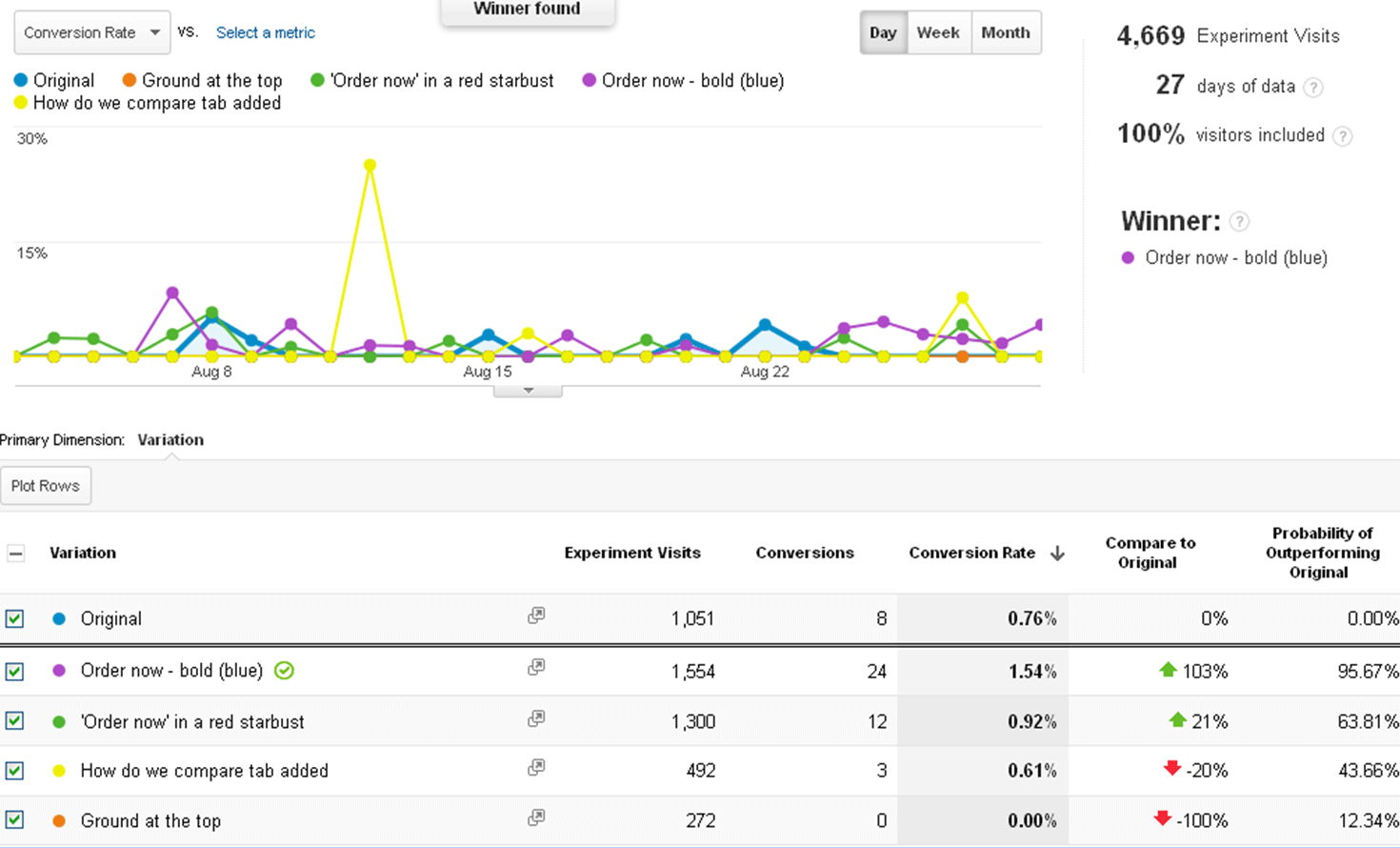 If you have a very usable site with poor SEO, people won’t find your site. If I use SEO to build your audience, but your website sucks, you’re not going to get as much bang for your SEO buck. Usability is the science of making things not suck. SEO makes search robots happy. Usability makes people happy. The marriage of the two equals high ROI. This last image (above) shows how one little four week experiment caused visitors to be twice as likely to convert into customers. It cost very little to run that experiment and it paid for itself in one day. The rest is gravy. That it’s difficult to convince companies to invest in SEO and usability never ceases to amaze me, but I won’t stop trying (or complaining.) Thanks for reading.