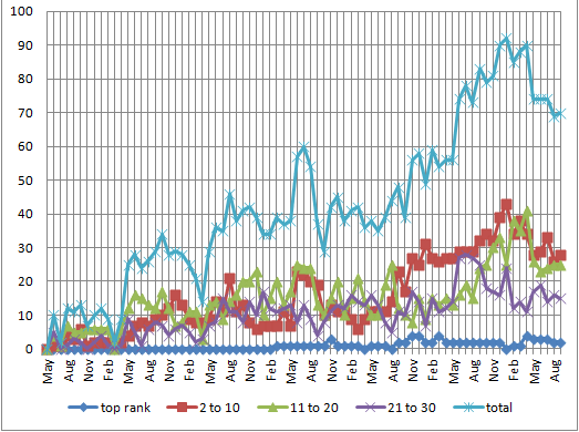 This other graph for the same client, though only tenuously related, needed a place to live in the blogosphere. Many of the campaign’s most broad metrics have been sluggish, flat or even slowly tanking over the past year because they cover all three major search engines as a whole. The chart at right (click it for a larger version) shows that SERP listings have been tanking in Bing and Yahoo, while Google’s doing alright. My SEO work will often please Google more than Bing and Yahoo, and this account exhibits the extreme of that trend. Because Google is responsible for the vast majority of searches performed in the US, I’ve never wasted much effort focusing on the other search engines. So while I likely won’t get more budget to play with, I have a Q1 2013 plan to address some of the issues. Ping me in six months if you want an update.