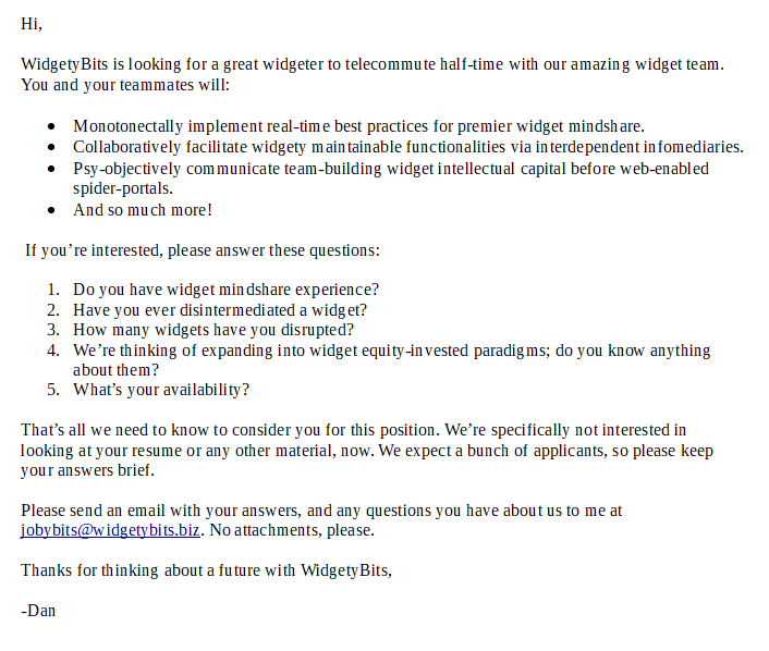 Some applicants have ignored my requests for email and instead tried to contact me about positions via blog comments. That’s a non-starter for me. - Résumés are a pain. As you’ll see below, without a resume in the mix it’s easier to measure attention to detail. It may seem unorthodox to start candidate screening without a resume, but that’s a whole other document to sift through. Stick to introductions for now. Request a resume when you’re sure you want it. Until then, specifically instruct applicants to NOT send a resume.