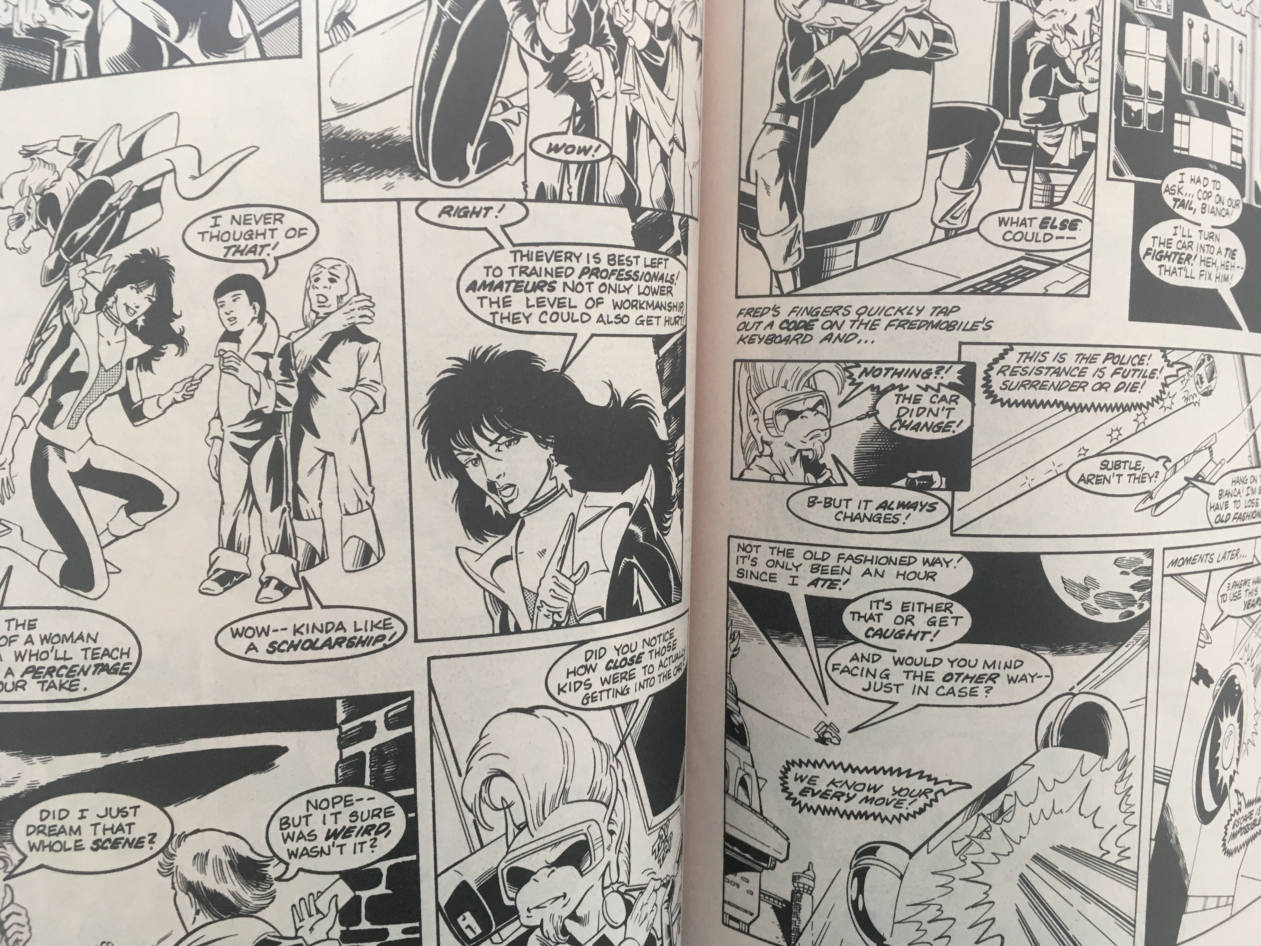Stylistically slick, with refined lines, the art of the Aristocratic Xtraterrestrial Time-Traveling Thieves reeks of popular comic book art tropes of most eras. That is to say, if you’re looking for familiarity in your Twisted Tweener Taekwondo Tortoise titles, this might be your jam, artistically. Not that I remember anything about this book. I mean, other than it being a TMNT knockoff, that is. The TMNTs had April; this comic also featured a strong-willed chick, it seems. #KnowYourTargetMarket?