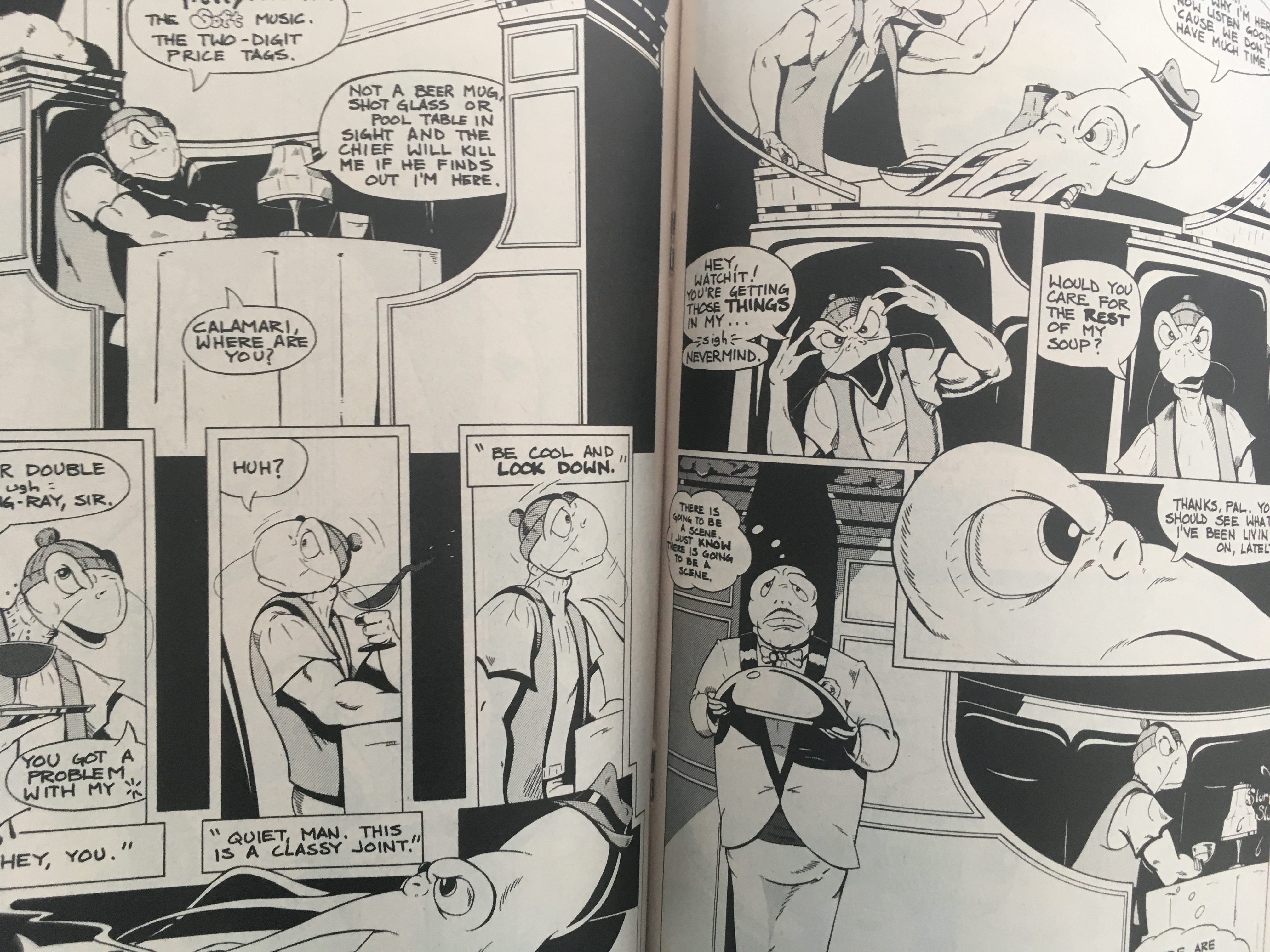 Okay, so, this one barely squeaks into the collection. First, it’s a reprint. (shudder) Secondly, by some accounts The Fish Police isn’t technically a TMNT knockoff. Creator Steve Moncuse allegedly sketched some of the characters before TMNT published issue #1. Still, TMNT #1 published in May 1984 with Fish Police dropping its premier issue more than a year later. Seems fishy to me.