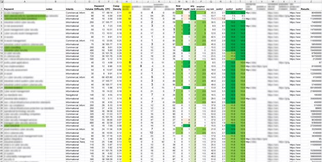 =IF(Z2="","",IF(D2>0,LOG10(D2+1)*2,0)+IF(F2<>"",MIN(F2,105)/105*3,0)+IF(E2<>"",E2*0.25,0)+IF(P2<>"",P2*3,0)-IF(Z2<10000,3,IF(Z2>2000000000,3,0))-IF(COUNTIFS(H2:L2,">0",H2:L2,"<=30")=0,10,0)) - weak? – A quick cut-metric to eliminate keywords scoring poorly on several other diagnostics. Easily tunable.