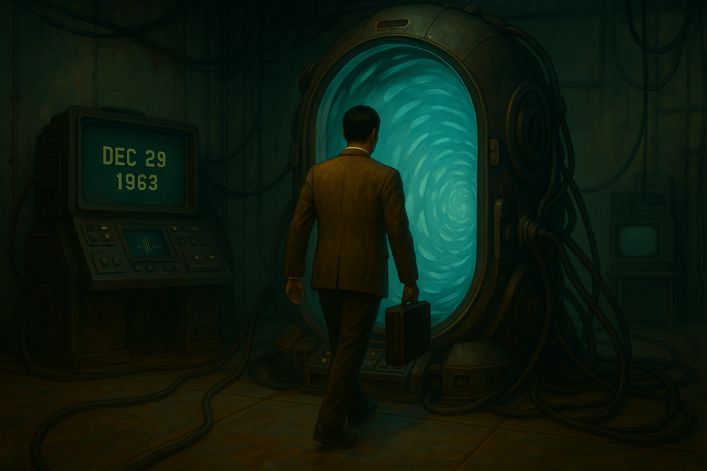 Trusting the AI, controls calibrated to December 29, 1963, inaugural Temporal Agent Chang enters the pod with $100,000 in period-appropriate greenbacks and one goal: